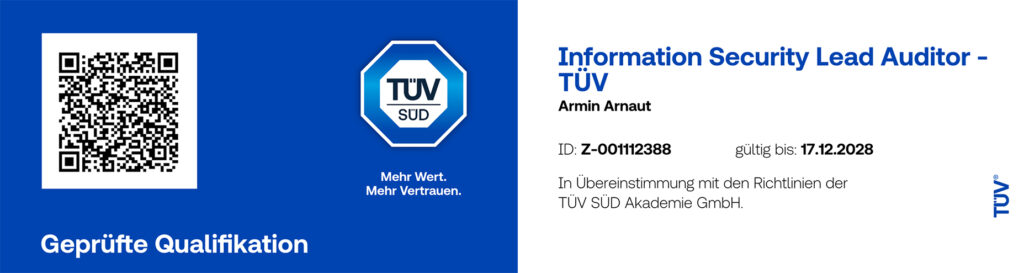 Information Security Lead Auditor (geprüft durch TÜV Süd), Chief Information Security Officer (geprüft durch CBT Training & Consulting GmbH), IT-Spezialist (geprüft durch die IHK), Projektleiter nach ISO 21500 und DIN 69901 (geprüft durch die IHK)